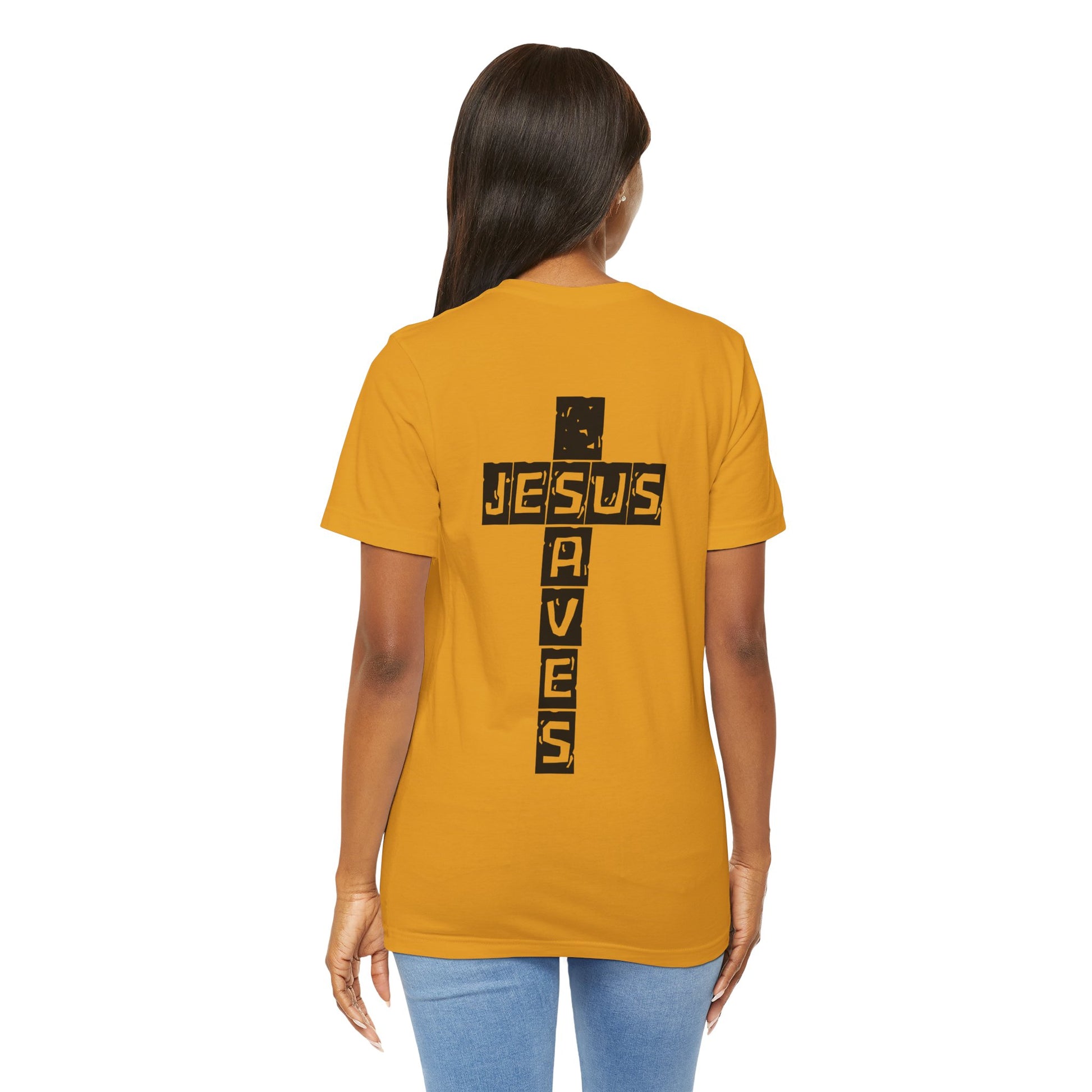Proclaim the heart of the Gospel with this “Jesus Saves” Christian T-Shirt, featuring a powerful cross-shaped typography design. The words Jesus Saves are intentionally arranged to form the cross, symbolizing salvation, redemption, and the finished work of Christ.